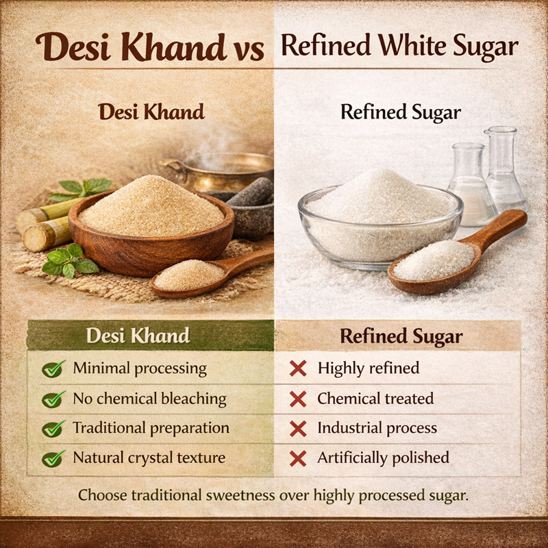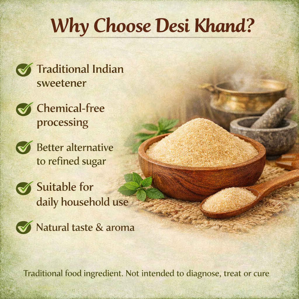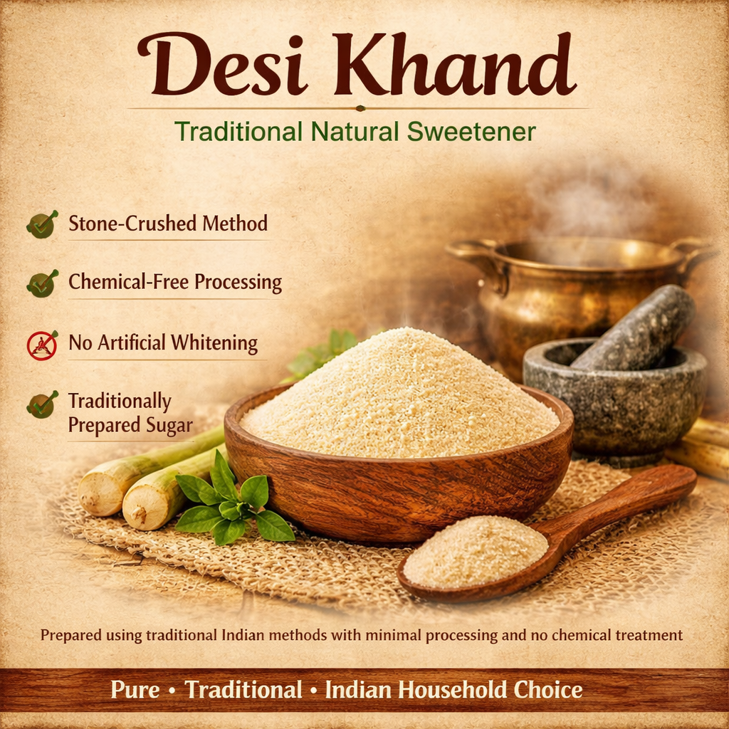 Switch to a sweeter, better, and healthier alternative to sugar today. Bring home Pure Desi Khand processed from Sugarcane crystals. Desi Khand is good for health as it is not being processed with Sulphur. Unlike Sugar, Khand is not processed through a bleaching process which takes away the natural minerals and often leaves harmful chemicals.