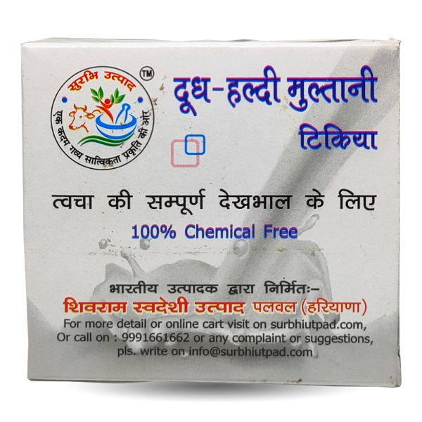 Surbhi Doodh Haldi Multani tikiya made with Multani mitti or Indian breed cow milk. This is 100% chemical free product. It will nourish and soften your skin. Keep dryness away, highly effective on acne and pimples. All season product. A complete environment friendly product.