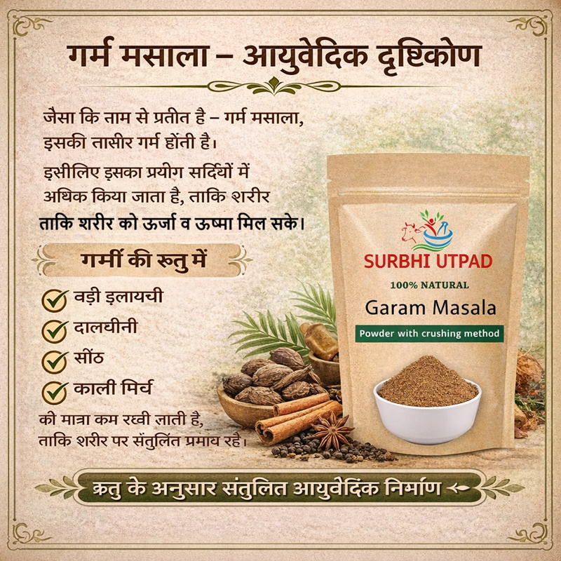 जैसा की नाम से प्रतीत है ( गर्म मसाला ), अर्थात इसकी तासीर गर्म है| इसी लिए इसका प्रयोग सर्दियों में ज्यादा किया जाता है ताकि यह शरीर को गर्म रख सके| इसलिए आयुर्वेद ने गर्म मसाले के लिए लगभग इनऔषधियों (छोटी और बड़ी इलायची, लोंग, दाल चीनी, सोंठ, जावित्री, जायफल, तेज पत्ता, काली मिर्च, जीरा और पिपली ) के बारे में बताया है| और इन सभी  उत्तम घटकों का प्रयोग इस मसाले में करते है| इन औषधियों का चूर्ण कूटकर बनाते है न की पीसकर|
