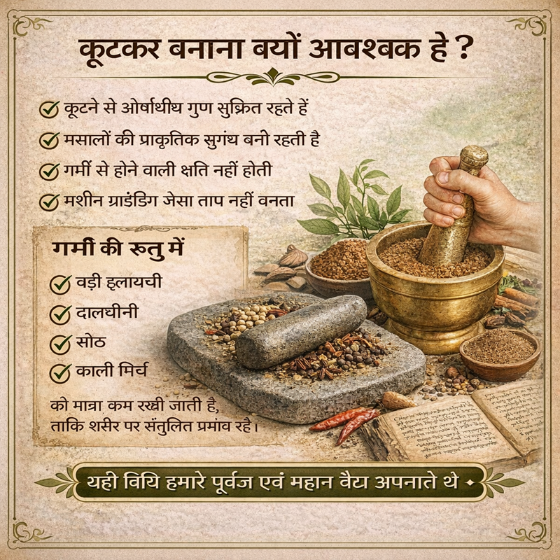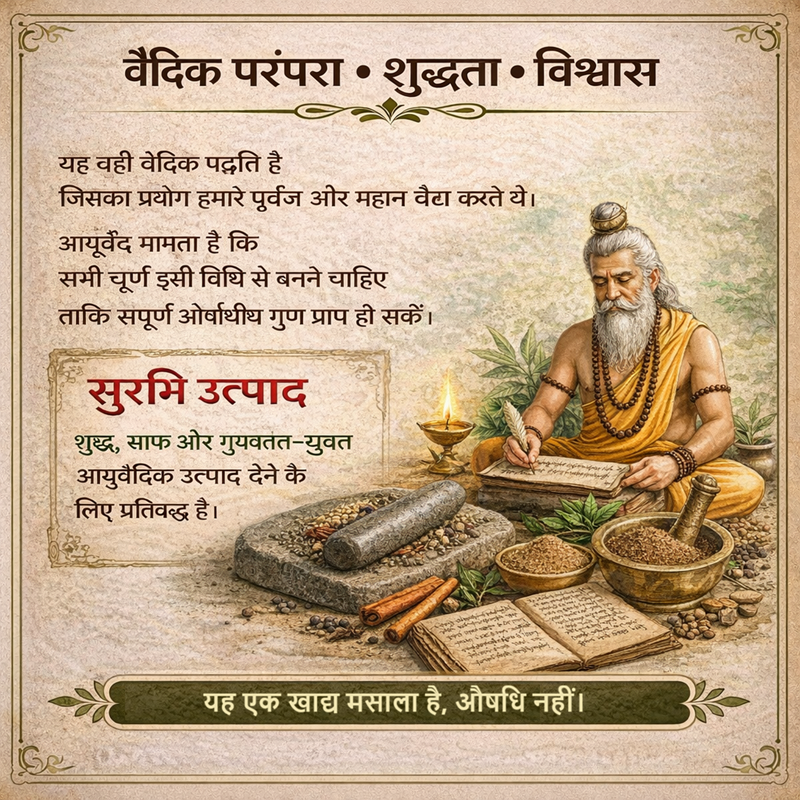 यह उसी वैदिक पदत्ति से बनाया जाता है जिसका प्रयोग हमारे पूर्वज और महान वैध किया करते है| यही नही सभी चूर्ण इसी विधि  से बनने चाहिए जिससे हमे सभी औषधीय गुण प्राप्त ही जाए|  सुरभि उत्पाद आपकी इसी कड़ी को पूरा कर शुद्ध, साफ व् गुणवत्ता युक्त उत्पाद देने के लिए प्रतिबद्ध है|