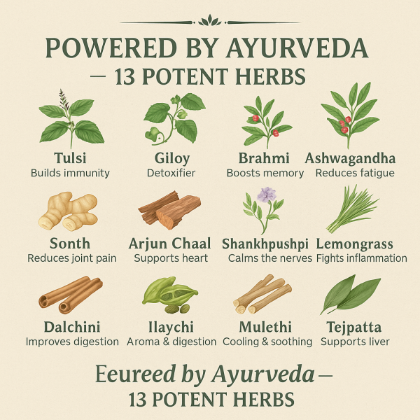 · Pipal Leaves · Arjun Chaal · Brahmi · Ashvgandha · Tejpatta · Mulaithi